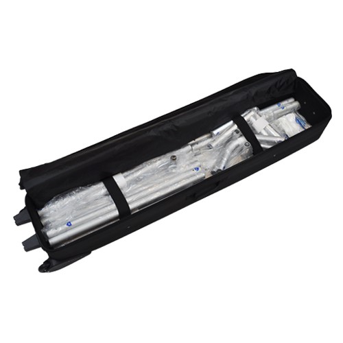 Het lichtgewicht aluminium buizenframe met een diameter van 32 mm wordt dmv een zogenoemd kliksysteem aan elkaar gekoppeld, waardoor het complete frame super snel opgezet is, inclusief strakgespannen doek. Alle frames met bijbehorende doeken worden geleverd incl. luxe koffer met wielen, folie, handschoenen en handleiding.